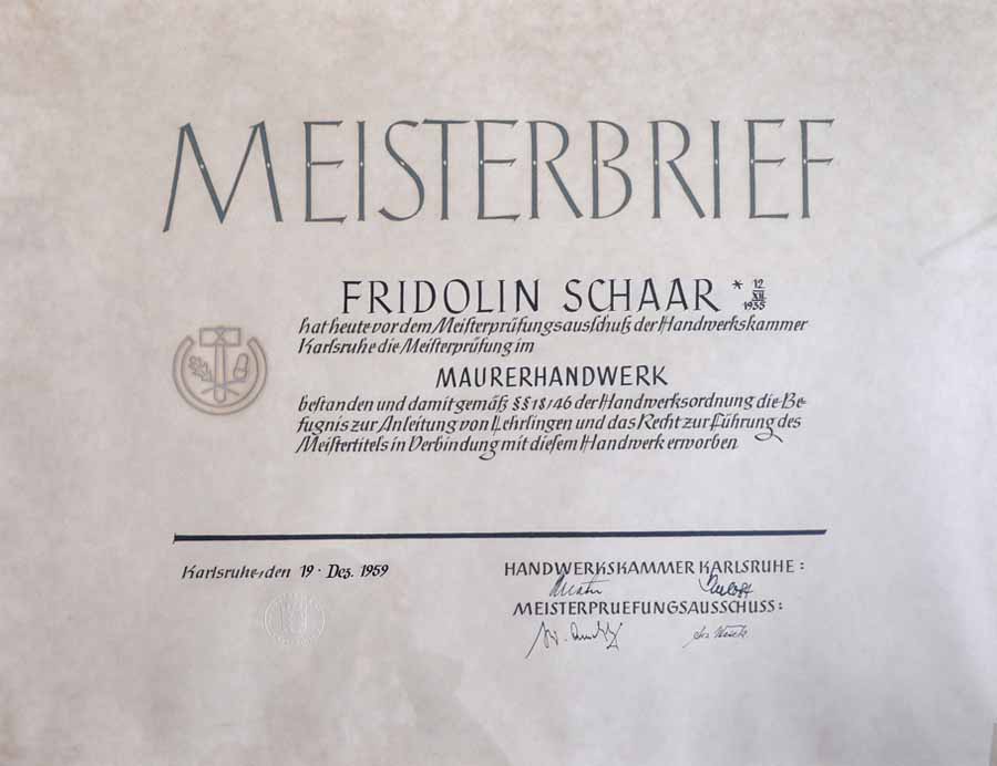 1960 wechselte die Führung zu Fridolin Schaar über, der das Unternehmen mit viel Erfolg und Engagement leitete. Am 01.01.1999 übergab er seinen Betrieb an uns – seine Söhne.