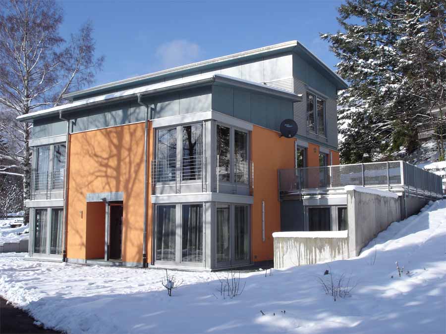 Zukunftsdesign in der Gegenwart, unterschiedliche Baustoffe im Einklang. Das Einfamilien-Wohnhaus basierend auf massiven Keller- und Erdgeschoss-Elementen, das Dachgeschoss variabel erweiterbar in Holzständerbauweise. Ein Haus für die Zukunft und deren noch zu erwartenden Überraschungen gerüstet.