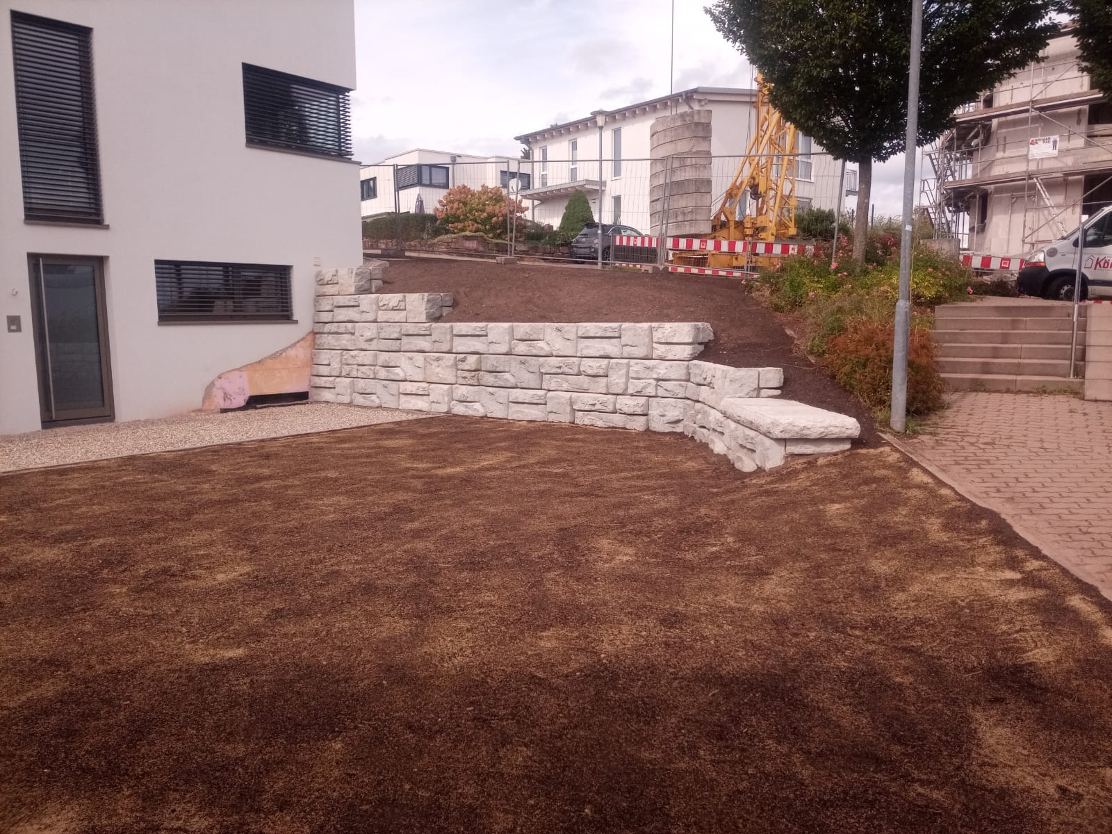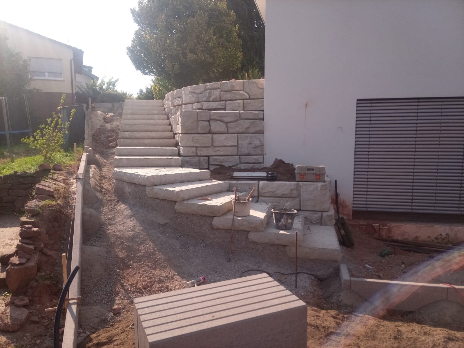 Böschungsbefestigung als Schwergewichtswand mit Treppe aus gleichem System.
